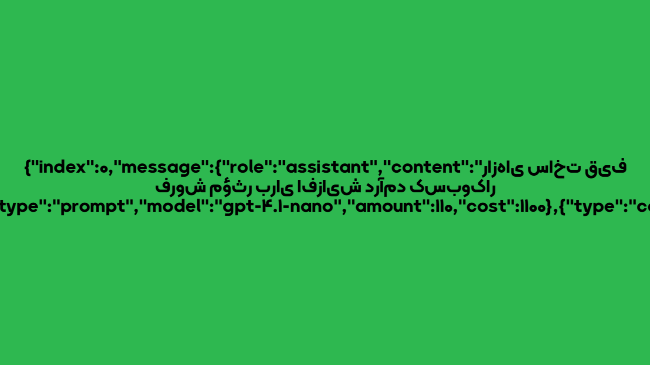 {“index”:0,”message”:{“role”:”assistant”,”content”:”رازهای ساخت قیف فروش مؤثر برای افزایش درآمد کسبوکار شما”,”refusal”:null,”annotations”:[]},”logprobs”:null,”finish_reason”:”stop”,”usage”:[{“type”:”prompt”,”model”:”gpt-4.1-nano”,”amount”:110,”cost”:1100},{“type”:”completion”,”model”:”gpt-4.1-nano”,”amount”:16,”cost”:640}],”via_ai_chat_service”:true}